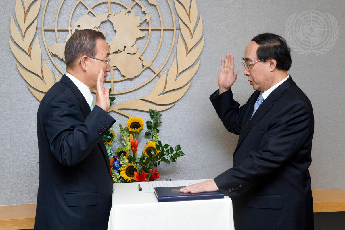 Secretary-General Ban Ki-moon (left) swears in Wu Hongbo, Under-Secretary-General for Economic and Social Affairs (DESA).