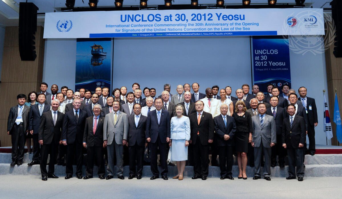 Group photo of the participants of the international conference commemorating the 30th anniversary of the opening for signature of the UN Convention on the Law of the Sea held at the Yeosu World Expo today. At front row centre are Secretary-General Ban Ki-moon (sixth from left) and his wife, Yoo Soon-taek.
