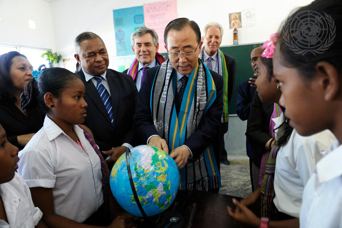 Secretary-General Ban Ki-moon (centre) interacts with children on his visit to the Cassait Primary School in the Liquica district of Timorese capital Dili. Behind Mr. Ban, at left, is Gordon Brown, U.N. Special Envoy for Global Education and former Prime Minister of the United Kingdom.