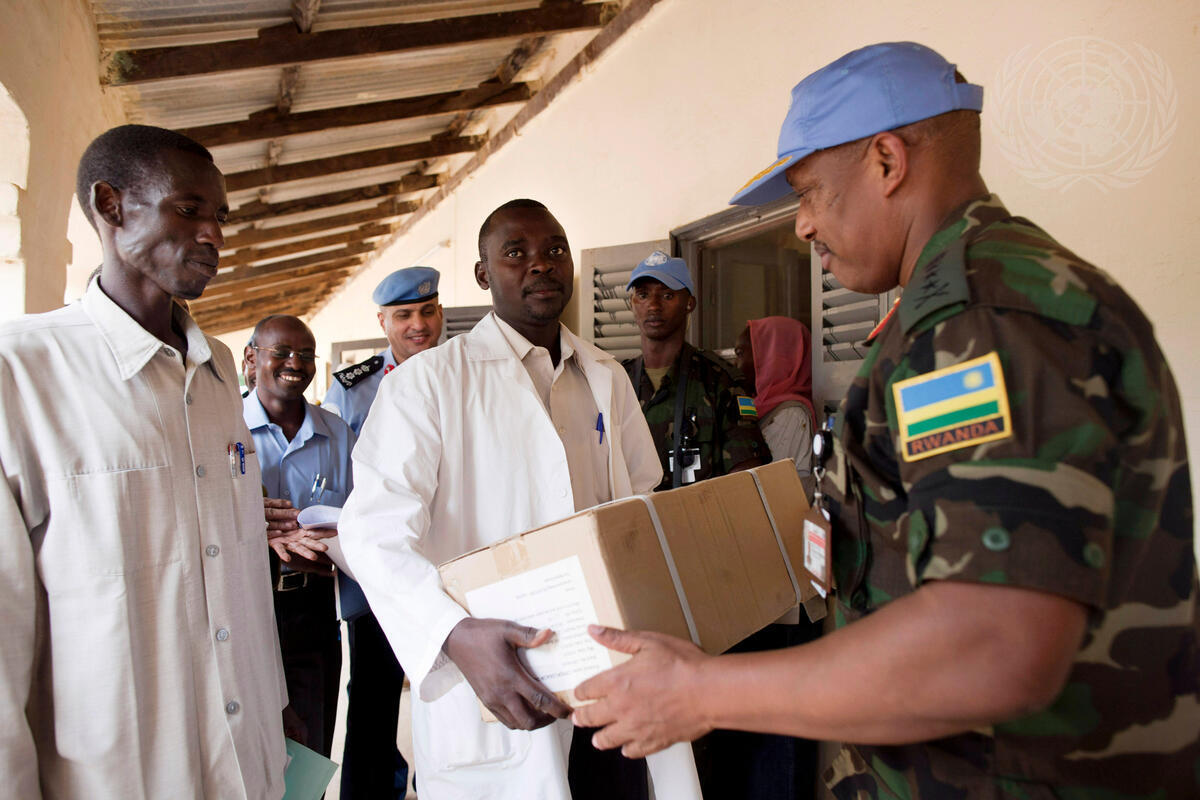 Force Commander Patrick Nyamvumba (right) hands over medical supplies donated by the African Union-UN Hybrid Operation in Darfur (UNAMID) to Doctor Noreldeen Adam (centre), Director of the Rural Hospital in Kutum, and Mustafa Bakhit, Deputy Commissioner of Kutum.
