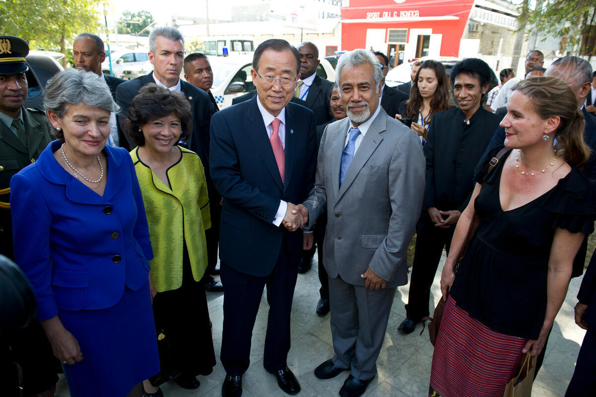 Secretary-General Ban Ki-moon (centre left) is greeted by Kay Rala Xanana Gusmão (centre right), Prime Minister of the Democratic Republic of Timor-Leste, at the Museum of the Resistance in Timorese capital Dili. Accompanying Mr. Ban on his two-day visit to the country are Irina Bokova (left), Director-General of the UN Educational, Scientific and Cultural Organization (UNESCO); and Noeleen Heyzer (second from left), Executive Secretary of the UN Economic and Social Commission for Asia and the Pacific (ESCAP). At right is Mrs. Kristy Sword Gusmão.
