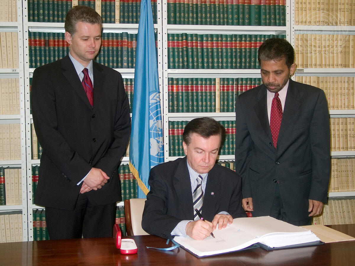 Janusz Stancyk (seated), Permanent Representative of Poland to the United Nations, signs the World Health Organization Framework Convention on Tobacco Control.
