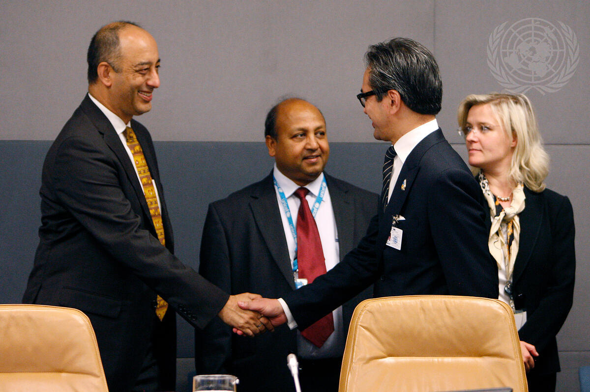 Marty M. Natalegawa (second from right), Minister for Foreign Affairs of the Republic of Indonesia, greets a participant of the ministerial-level meeting of the Group of Friends of the Secretary-General on Myanmar.