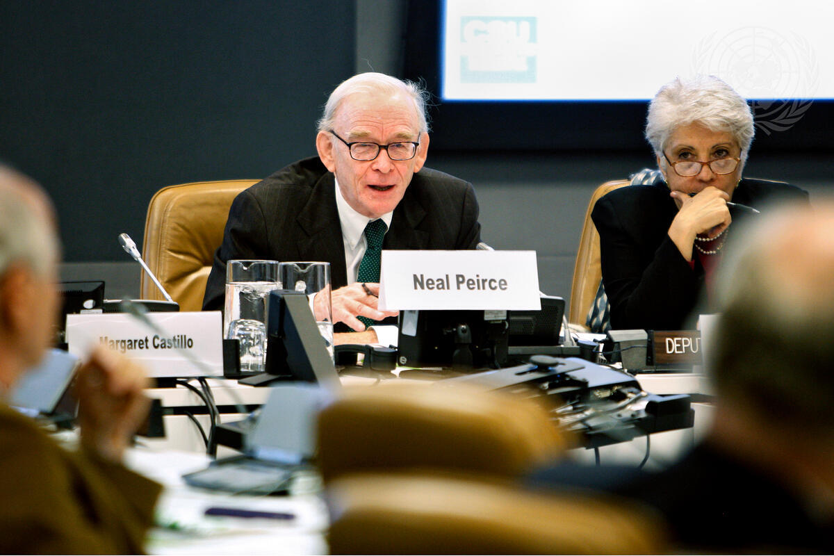 Neal Pierce (left) of the Washington Post Writers Group moderates a high-level discussion on “Cities and Climate Change”, organized by the UN Human Settlements Programme (UN-Habitat) as part of World Habitat Day. Beside Mr. Peirce is Cecilia Martinez, Director of the UN-Habitat New York Office.