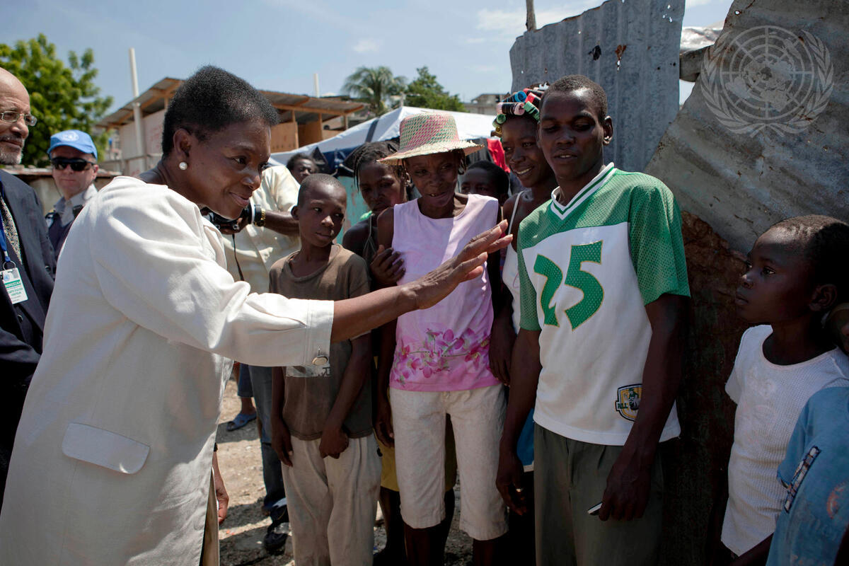 Valerie Amos (left), Under-Secretary-General for Humanitarian Affairs, greets young residents of Accra camp in Port-au-Prince, Haiti. They are among the many thousands still displaced since the January 2010 earthquake.