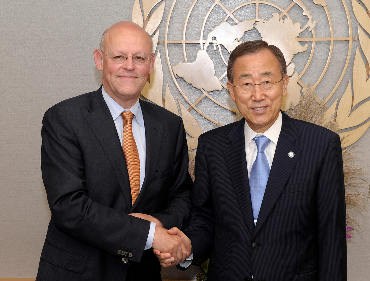 Secretary-General Ban Ki-moon (right) meets with Uri Rosenthal, Minister for Foreign Affairs of the Kingdom of the Netherlands.