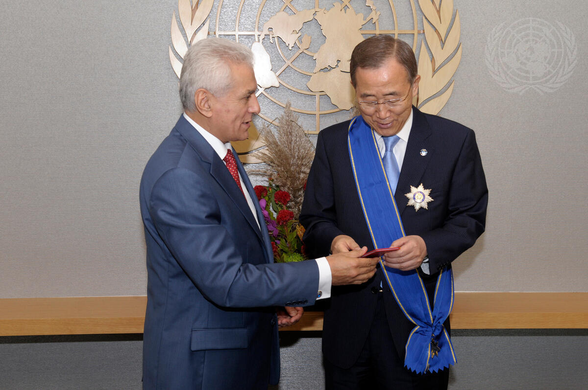 Secretary-General Ban Ki-moon (right) receives the High Honour Medal awarded by the President of Tajikistan from Hamrokhon Zarifi, Foreign Minister of Tajikistan.