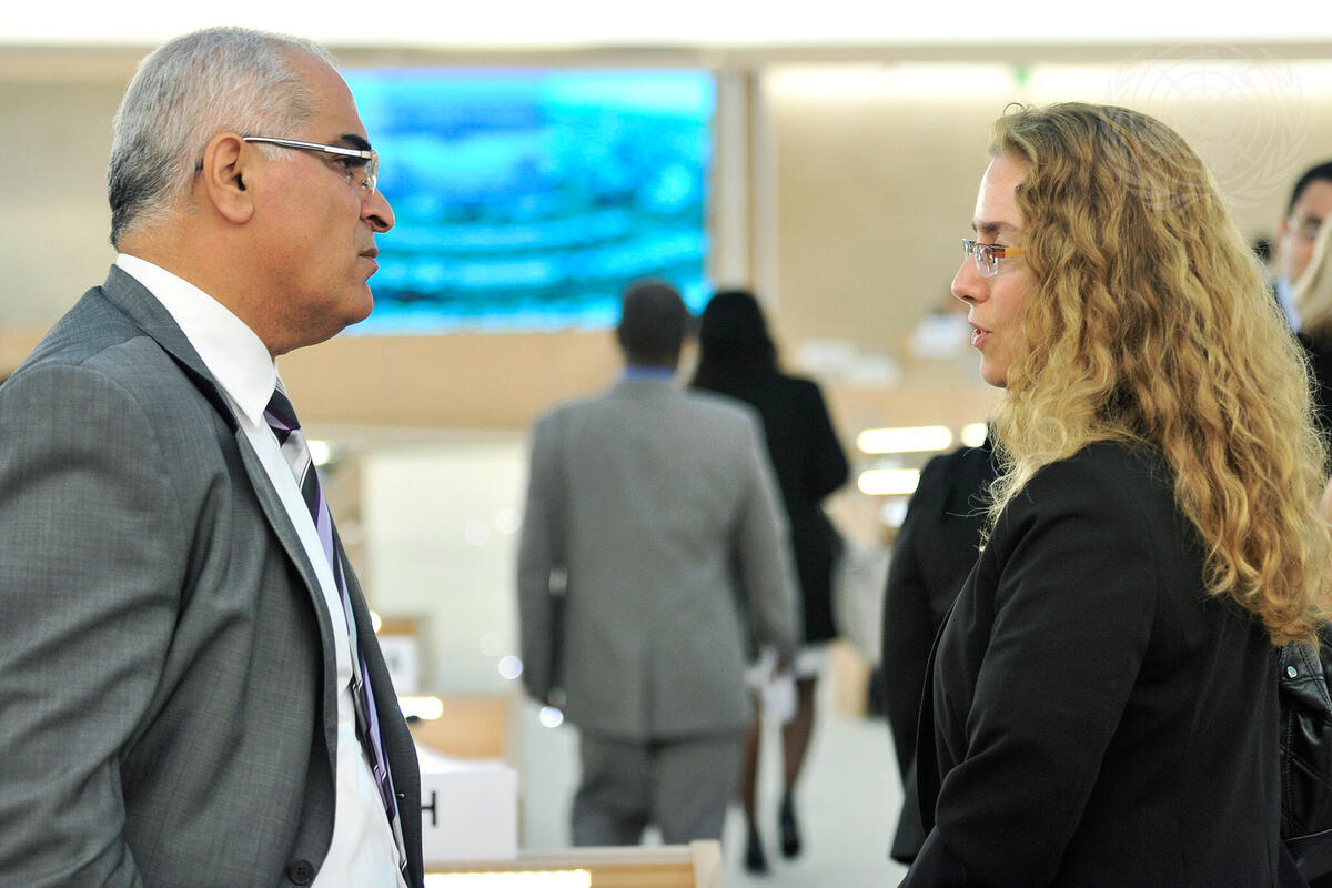 Laura Dupuy Lasserre (right), President of the Human Rights Council, and Ibrahim Khraishi (left), Permanent Observer of the Palestinian Authority to the United Nations in Geneva, exchange views during the 18th session of the Human Rights Council.