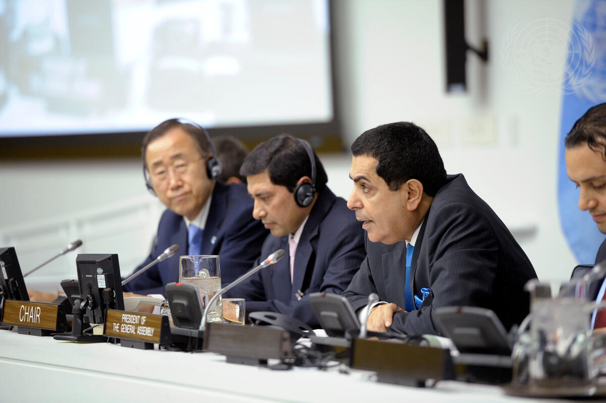 Nassir Abdulaziz Al-Nasser (right), President of the sixty-sixth session of the General Assembly, addresses the ministerial meeting of the Group of Least Developed Countries (LDCs). Secretary-General Ban Ki-moon is on the left.