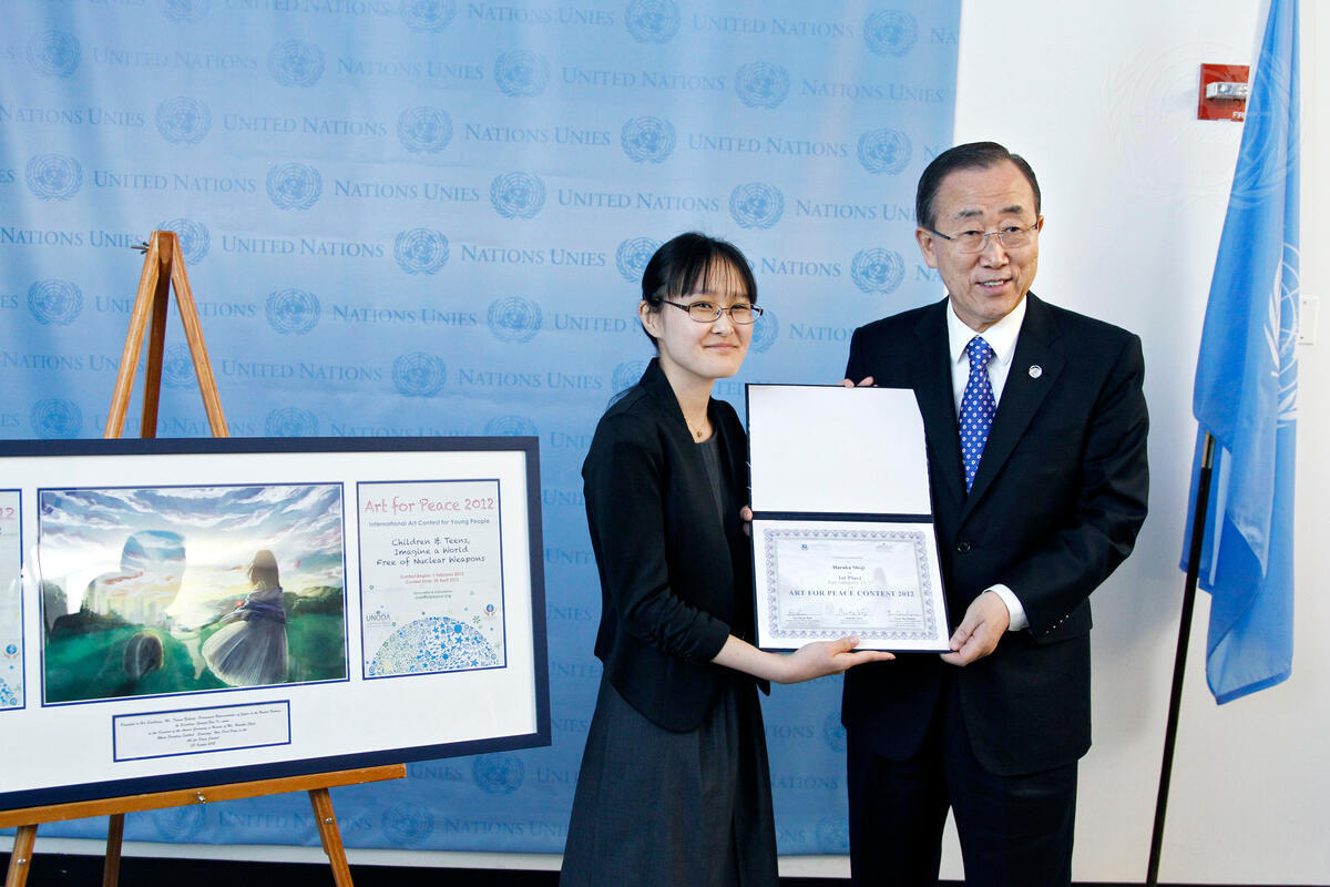 Secretary-General Ban Ki-moon (right) presents an award to Haruka Shoji, winner of the United Nations Art for Peace Contest, organized by the UN Office for Disarmament Affairs.