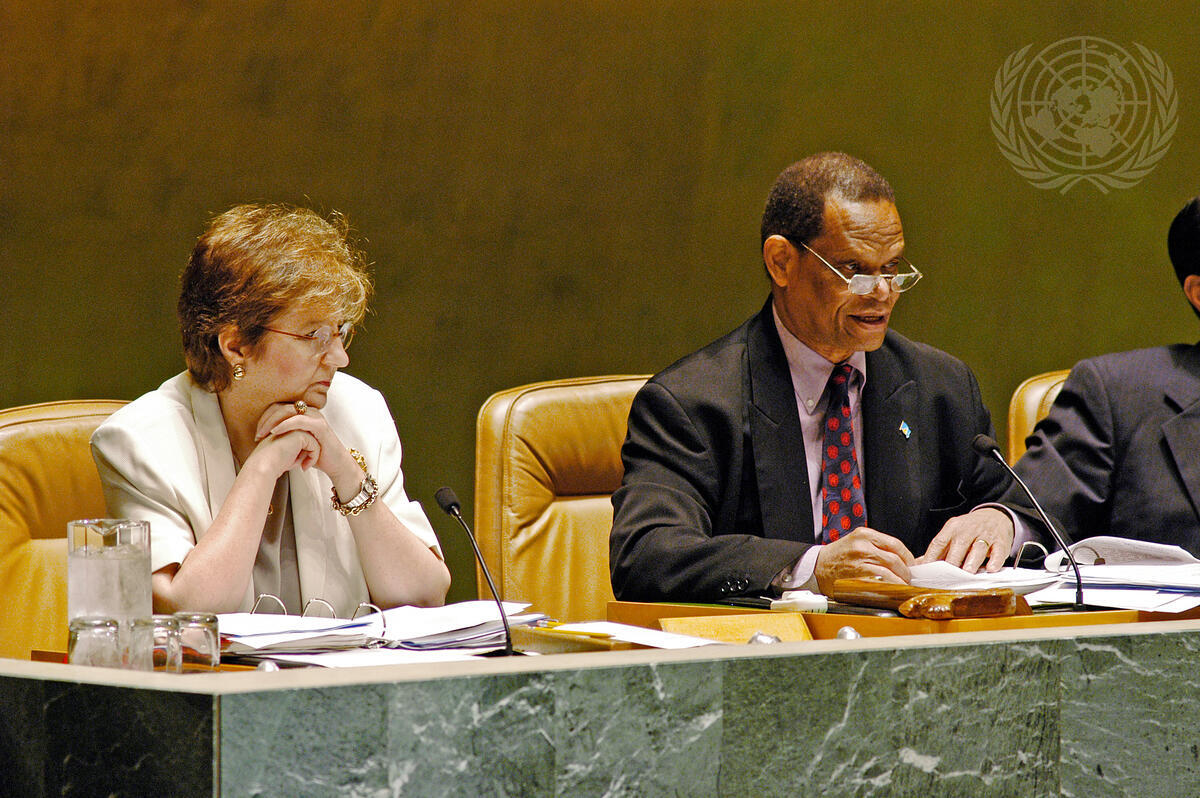 Deputy Secretary-General Louise Fréchette (left) and Julian R. Hunte, President of the Fifty-Eighth session of the General Assembly, attending the General Assembly, following the election of Jean Ping, Foreign Minister of Gabon, as the President of the Fifty-Ninth session of the General Assembly.