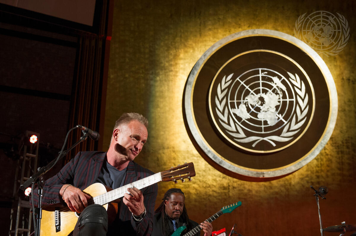 Multiple Grammy Award-winning artist Sting performs inside the General Assembly Hall for this year's UN Day Concert. Titled “A Message of Peace”, the concert is headlined by the UN Peace Messenger and American musical legend, Stevie Wonder.