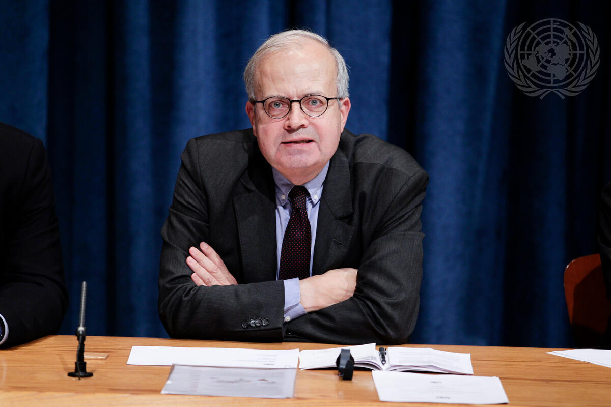 Emmanuel Decaux, Chair of the Committee on Enforced Disappearances, briefs journalists on the work of the Committee.