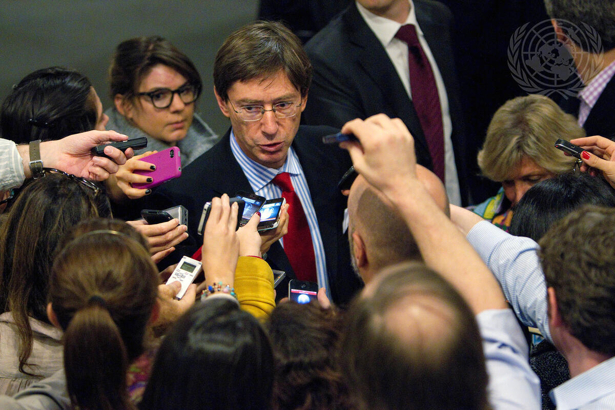 Peter Wittig (centre), Permanent Representative of Germany to the UN, speaks to journalists following a closed-door briefing to the Security Council by Lakhdar Brahimi, Joint Special Representative of the UN and the League of Arab States for Syria, on his initiative for a ceasefire in that country during the period of Eid al-Adha.
