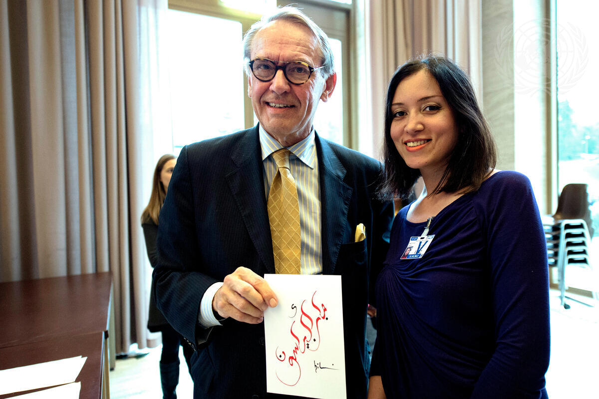 Deputy Secretary-General Jan Eliasson (left) poses for a photograph with a staff member during celebrations for today’s sixty-seventh annual United Nations Day, at the UN Office at Geneva (UNOG), Switzerland.
