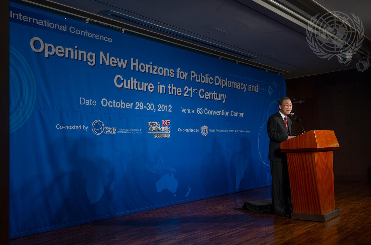 Secretary-General Ban Ki-moon speaks at an international academic conference in Seoul, on the theme, “Opening New Horizons for Public Diplomacy and Culture in the 21st Century”. The conference was jointly organized by the World Federation of United Nations Associations (WFUNA), the Korean Association of International Studies and the Korea Foundation.