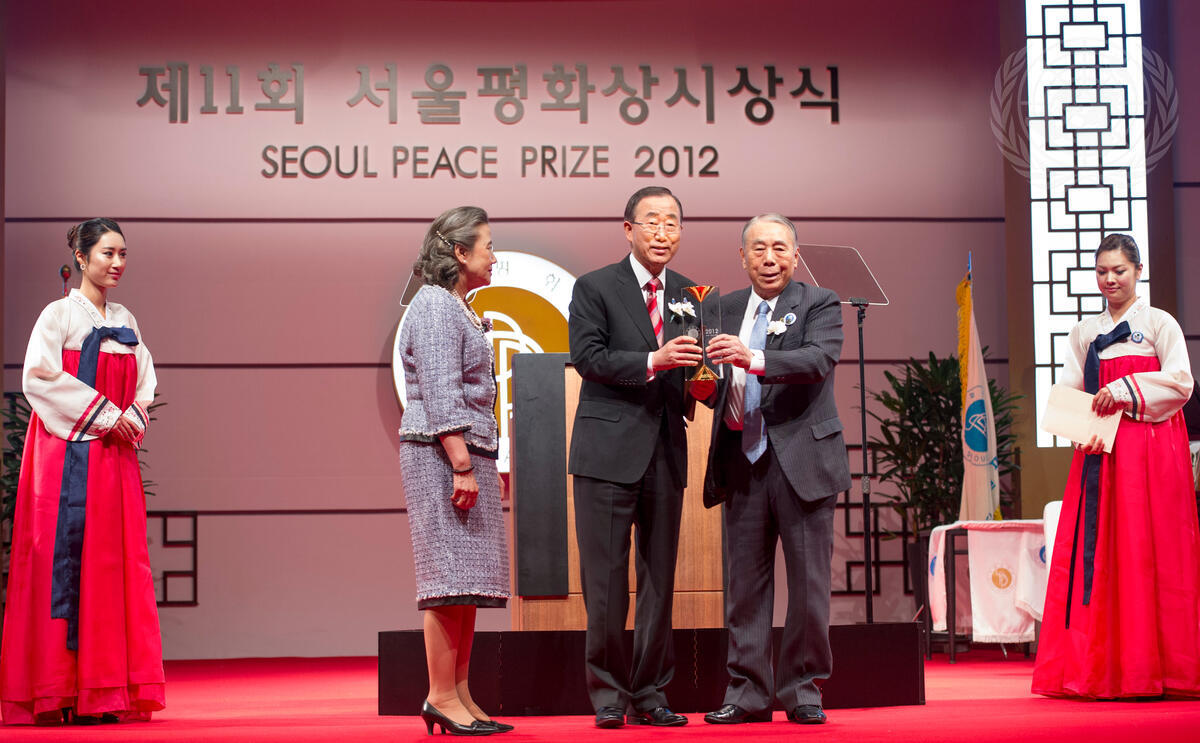 Secretary-General Ban Ki-moon (centre), accompanied by his wife, Yoo Soon-taek (left of Mr. Ban), is presented with the Seoul Peace Prize by Lee Chul-sung, President of the Cultural Foundation for the Prize, in Seoul.