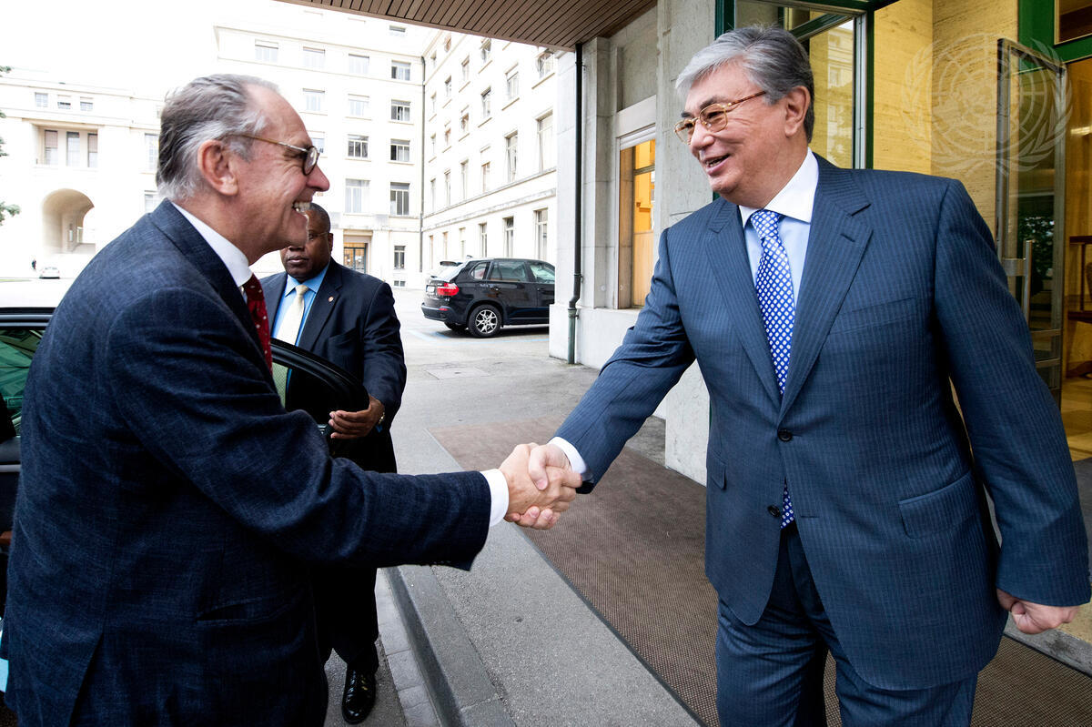 Deputy Secretary-General Jan Eliasson (left) meets with Kassym-Jomart Tokayev, Director-General of the United Nations Office at Geneva (UNOG), in Geneva, Switzerland.