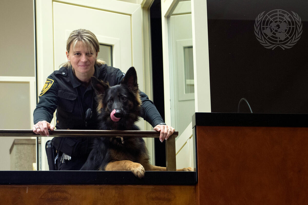 UN security officer and security dog, Zana, are shown about to conduct an explosives and firearms sweep before a press conference by Deputy Secretary-General Jan Eliasson in Geneva, Switzerland.