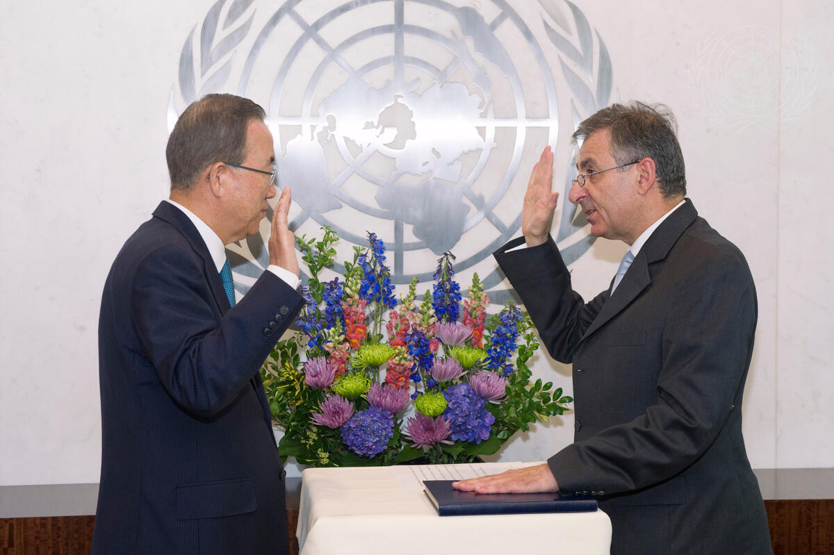 Secretary-General Ban KIi-moon (left) swears in Jean-Paul Laborde, Executive Director of the Counter-Terrorism Executive Directorate (CTED).