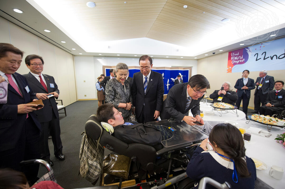 Secretary-General Ban Ki-moon (centre right) and his wife, Yoo Soon-tael (centre left), meet a young man with disabilities at the 22nd Rehabilitation International World Congress in Seoul, Republic of Korea.