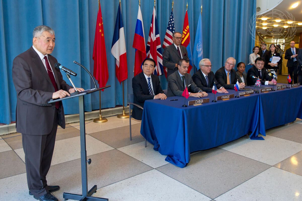 Enkhsaikhan Jargalsaikhan, the Permanent Representative of Mongolia to the OSCE, speaks at the signing of declarations regarding Mongolia's nucelar-weapon-free status. Seated at the table are the UN Permanent Representatives from the P5 and Mongola: (from left) Liu Jeiyi (China); Gérard Araud (France); Vitaly Churkin (Russian Federation); Mark Lyall Grant (United Kingdom); Susan Rice (United States); and Od Och (Mongolia).