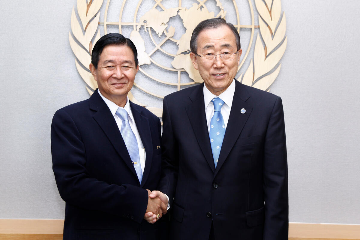 Secretary-General Ban Ki-moon (right) meets with U Aung Min, Minister in the Office of the President of the Union of Myanmar and Vice-Chairman of Myanmar’s Union Peacemaking Work Committee.