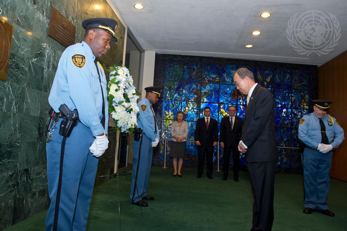 Secretary-General Ban Ki-moon (foreground centre) laid a wreath to honour Dag Hammarskjöld, second Secretary-General of the UN, who was killed in a plane crash 51 years ago today while on a peace mission for the Congo. Also present at the ceremony: Vuk Jeremic (background, centre), President of the sixty-seventh session of the General Assembly, flanked by Yoo Soon-taek (left), wife of the Secretary-General, and Deputy Secretary-General Jan Eliasson.
