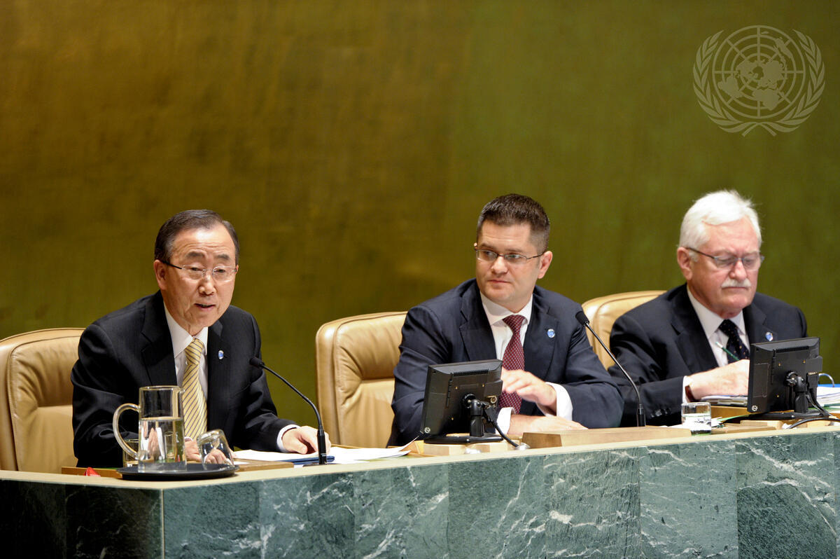 Secretary-General Ban Ki-moon (left) addresses the opening meeting of the General Assembly’s sixty-seventh session. Chairing the meeting is Vuk Jeremic (centre), President of the Assembly for this session. At right, Jean-Jacques Graisse, Acting Head for General Assembly and Conference Management.