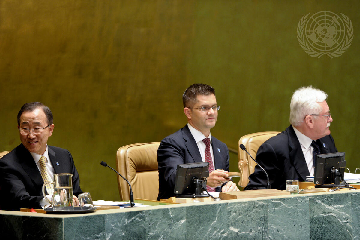 Vuk Jeremic (centre), President of the sixty-seventh session of the General Assembly, gavels open the session. He is flanked by Secretary-General Ban Ki-moon (left) and Jean-Jacques Graisse, Acting Head for General Assembly and Conference Management.