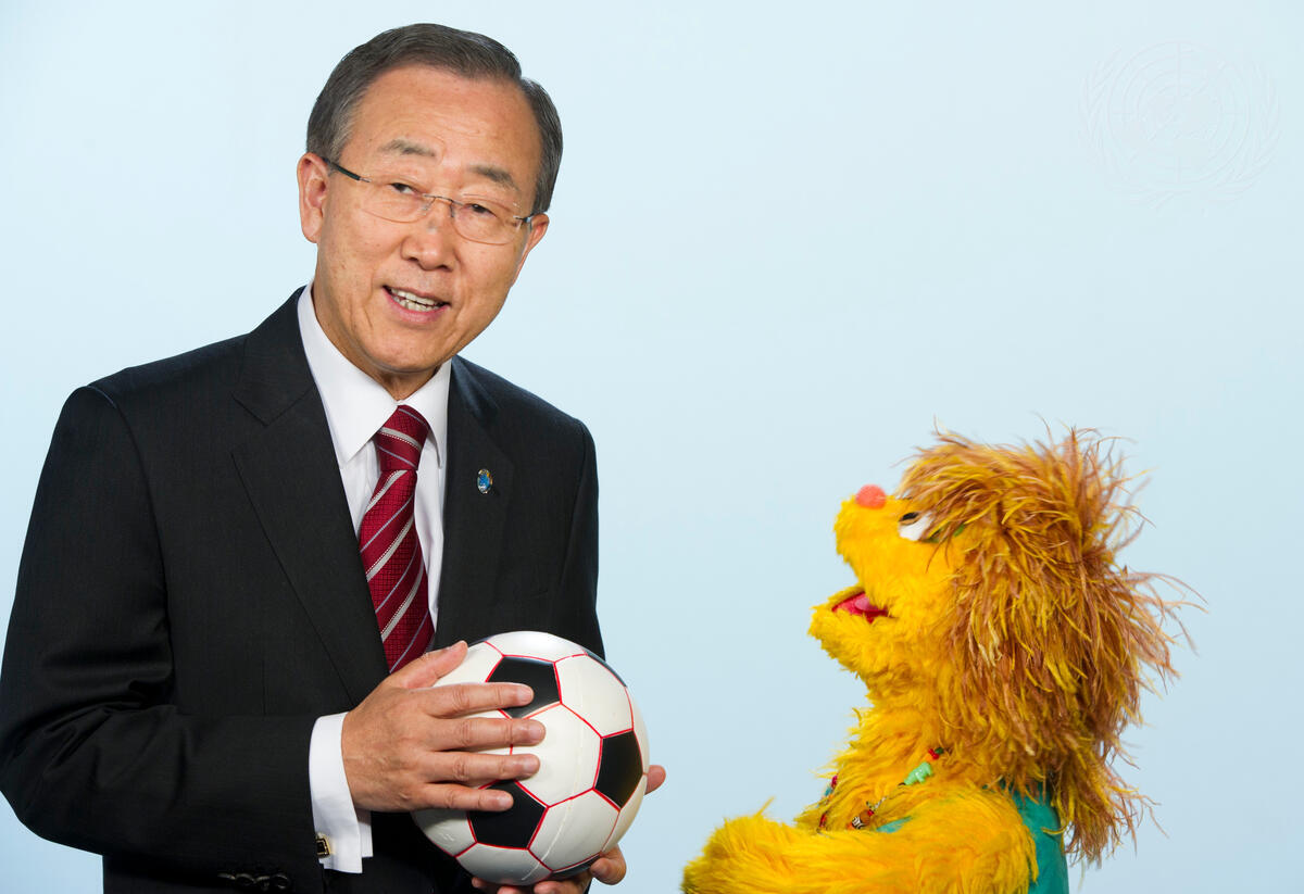 Secretary-General Ban Ki-moon meets Kami, an HIV-positive Muppet from Takalani Sesame, the South African version of Sesame Street, to raise global awareness about health.