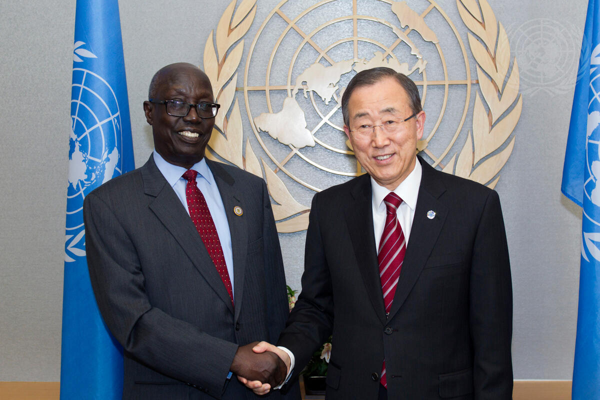 Secretary-General Ban Ki-moon (right) meets with Francis Mading Deng, new Permanent Representative of the Republic of South Sudan to the United Nations.