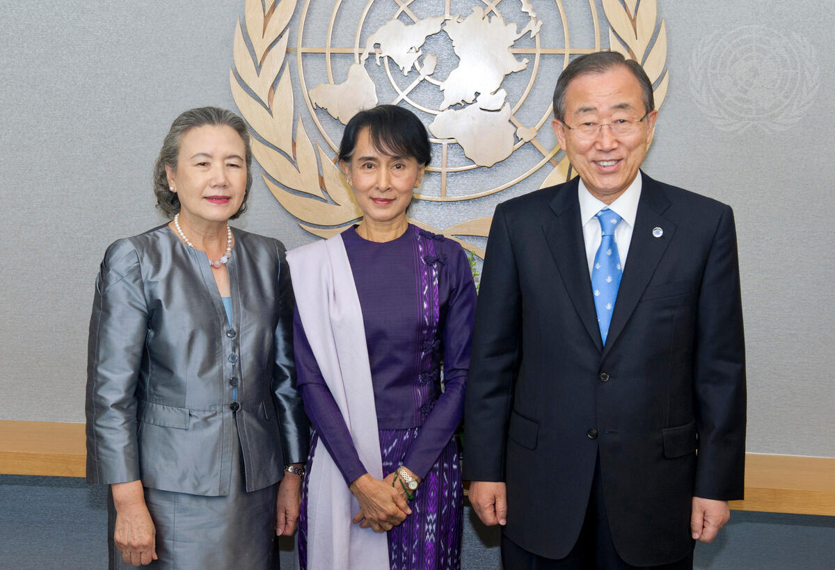 Secretary-General Ban Ki-moon (right) and his wife, Yoo Soon-taek (left), meet with Aung San Suu Kyi, Chairperson and General Secretary of the National League for Democracy of Myanmar.