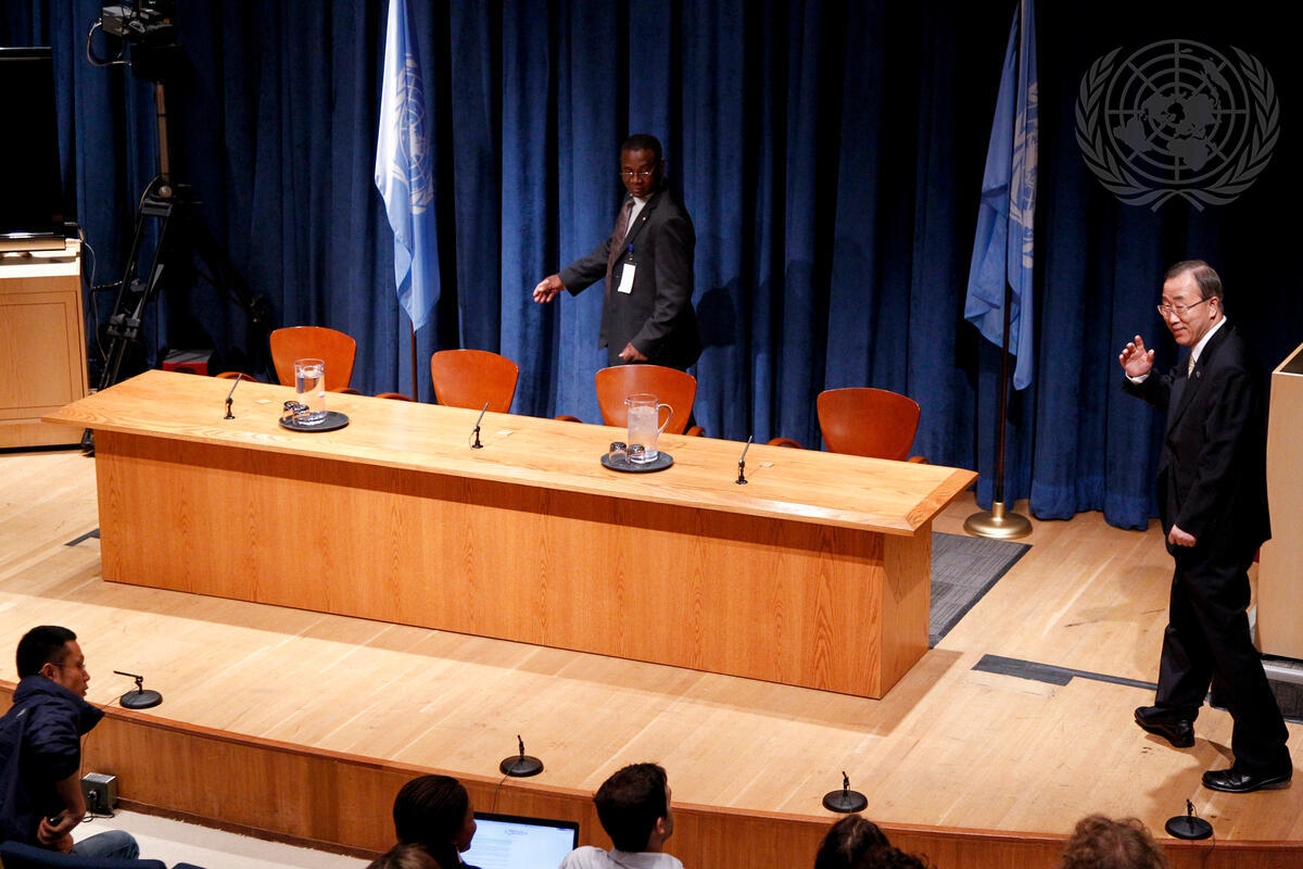 Mr. Ban (arrives) arrives for the press conference launching the report.