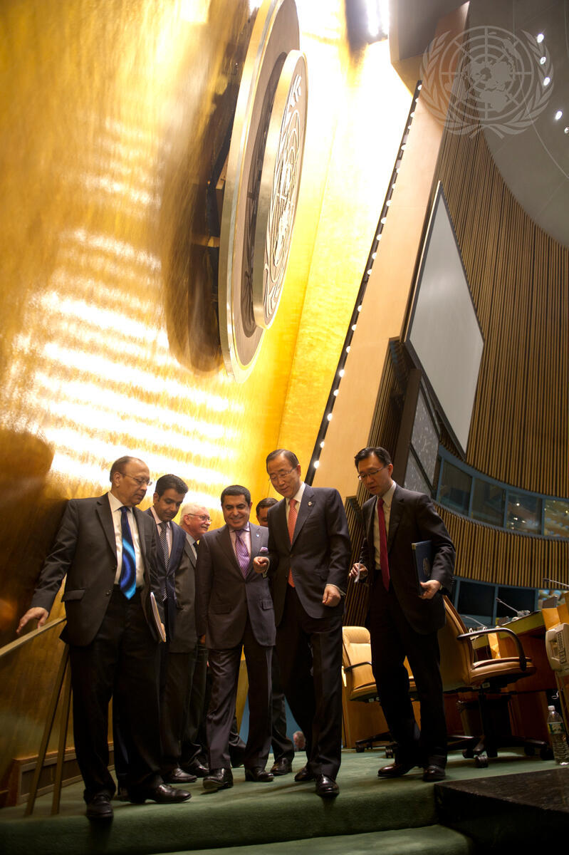 Nassir Abdulaziz Al-Nasser (centre), President of the sixty-sixth session of the General Assembly, on his way out of the General Assembly Hall at the conclusion of the Assembly’s last meeting under his presidency. With him are Secretary-General Ban Ki-moon (second from right), as well as (from left) Anwarul Chowdhury, Senior Special Advisor to the President; Mutlaq Al-Qahtani, Chef de Cabinet of the President; Jean-Jacques Graisse, Acting Head for General Assembly and Conference Management; and Yeocheol Yoon (right), UN Chief of Protocol.