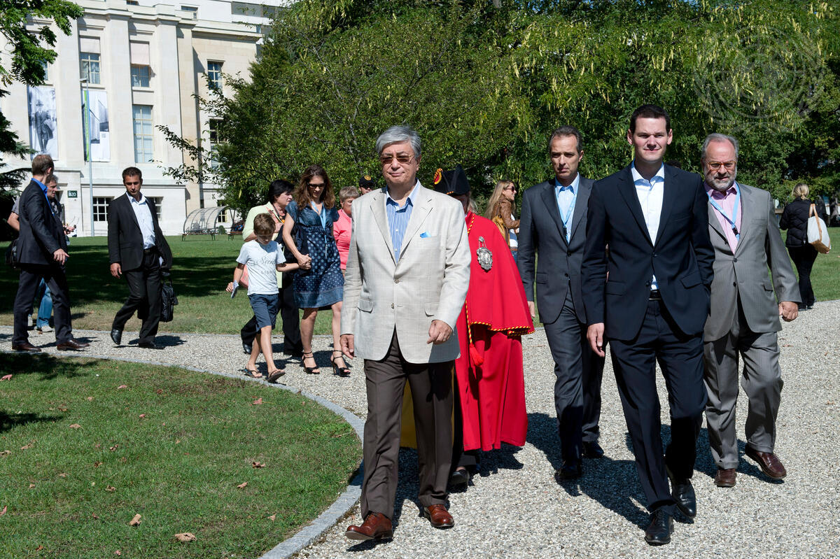 Kassym-Jomart Tokayev (front, left), Director-General of the UN Office at Geneva (UNOG); Dante Martinelli (right), Permanent Representative of Switzerland to UNOG; and Swiss State Councillor Pierre Maudet (second from right) are pictured on the grounds of UNOG’s Palais des Nations during the Open Day event.