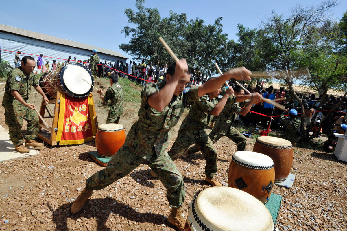 Japanese engineers with the UN Mission in the Republic of South Sudan (UNMISS) beat traditional drums during the hand-over ceremony of a way station to the UN refugee agency, UNHCR, in Juba. The engineer corps is assisting the Government of South Sudan in various reconstruction jobs, including the rehabilitation of roads.