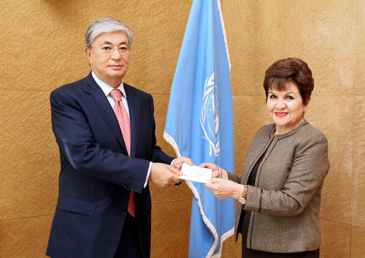 Victoria Marina Velásquez de Avilés, new Permanent Representative of El Salvador to the UN Office at Geneva (UNOG), presents her credentials to Kassym-Jomart Tokayev (right), Director-General of UNOG.