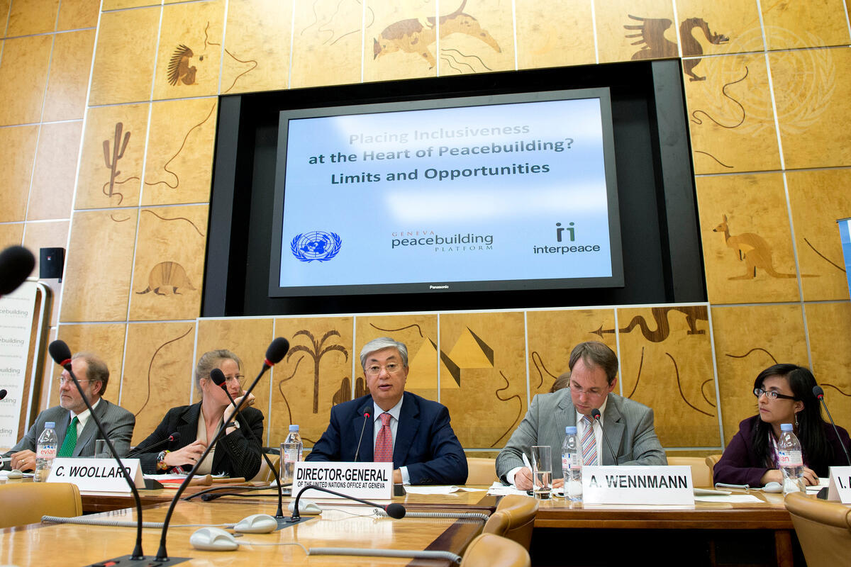 Kassym-Jomart Tokayev (centre), Director-General of the UN Office at Geneva (UNOG), speaks at a special event at UNOG’s headquarters on the International Day of Peace. He is flanked by Catherine Woollard, Executive Director, European Peacebuilding Liaison Office, and Achim Wennmann, Executive Coordinator of the Geneva Peacebuilding Platform.