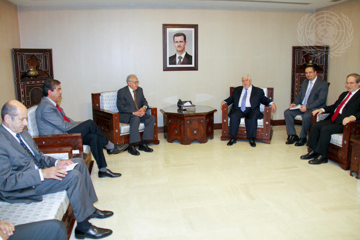 Lakhdar Brahimi (centre left), Joint Special Representative of the UN and the League of Arab States for Syria, meets with Walid Al-Moualem (centre right), Minister for Foreign Affairs of the Syrian Arab Republic.