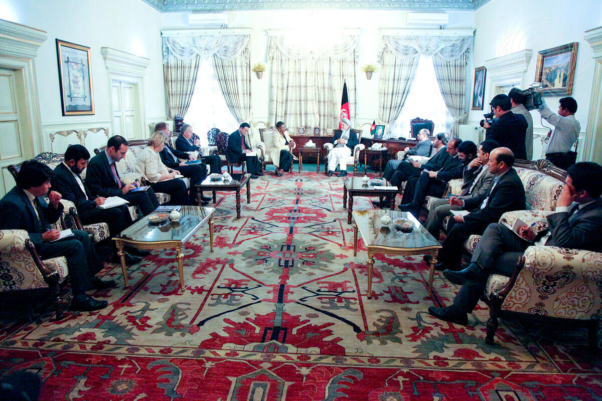 A wide view of the meeting between Valerie Amos, UN Under-Secretary-General for Humanitarian Affairs, and Mohammad Karim Khalili, Vice-President of Afghanistan, in Kabul.