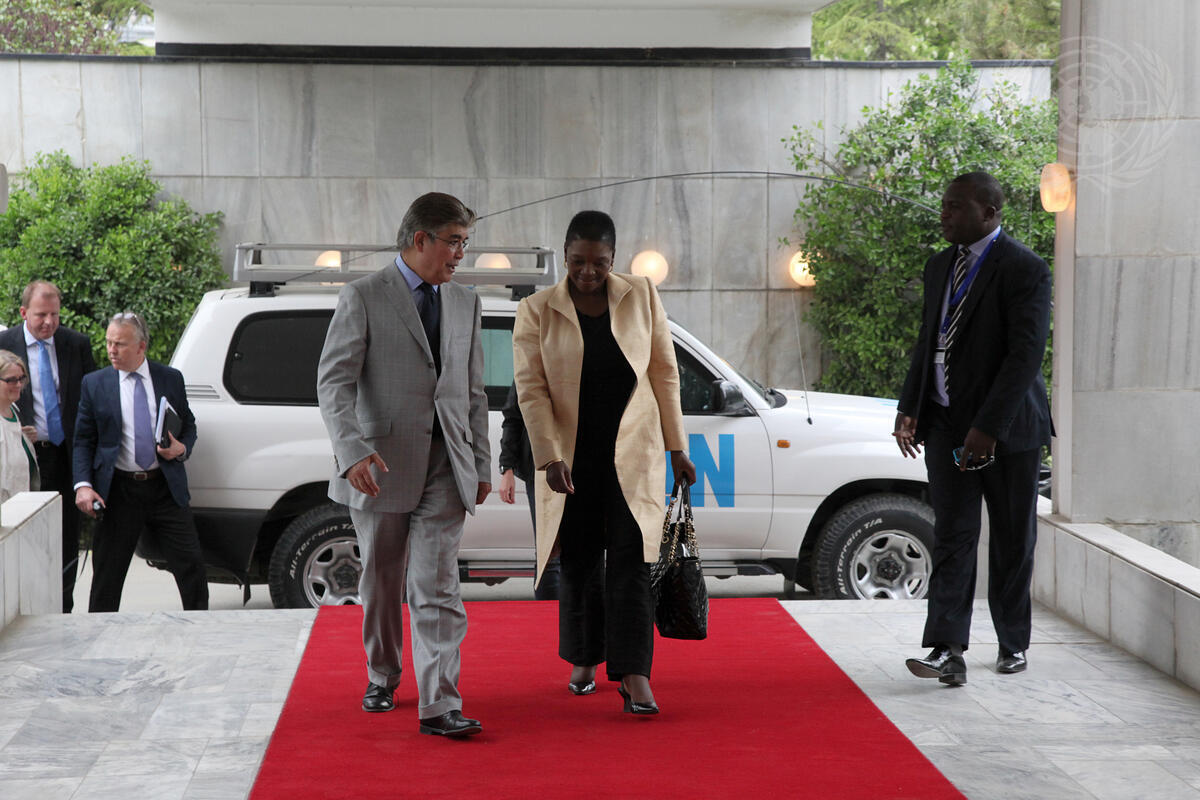 Valerie Amos (front, centre), UN Under-Secretary-General for Humanitarian Affairs and Emergency Relief Coordinator, arrives for a joint press conference with Afghanistan’s Minister of Rural Rehabilitation and Development, Wais Ahmad Barmak, at the Ministry for Foreign Affairs in Kabul.