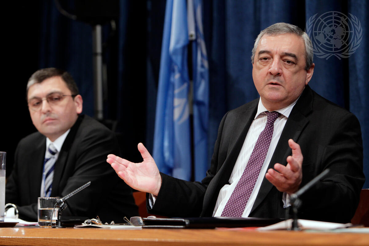 Agshin Mehdiyev (right), Permanent Representative of Azerbaijan to the UN and President of the Security Council for May, briefs the press on the Council’s programme of work for the month.