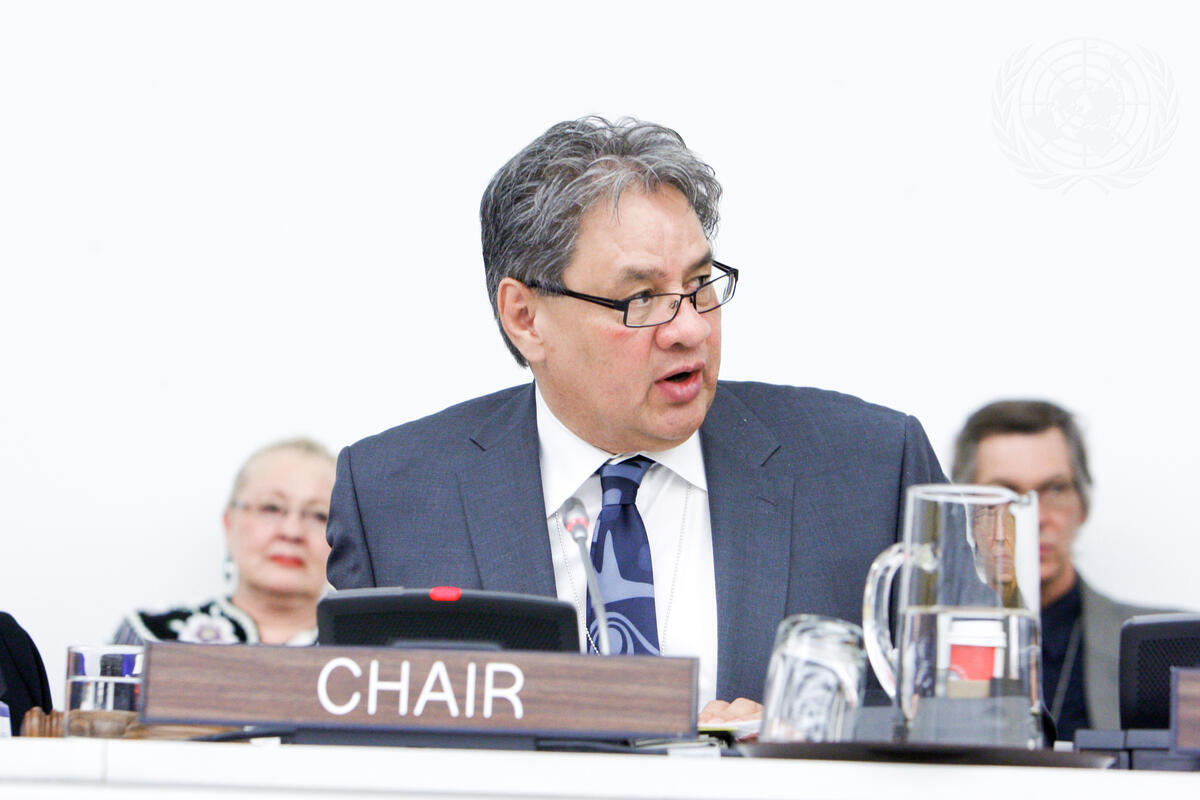 Edward John, Grand Chief of Canada’s Tl'azt'en Nation and Chair of the eleventh session of the UN Permanent Forum on Indigenous Issues (UNPFII), addresses a meeting of the session, whose theme this year is “The Doctrine of Discovery: Its Enduring Impact on Indigenous Peoples and the Right to Redress for Past Conquests”.