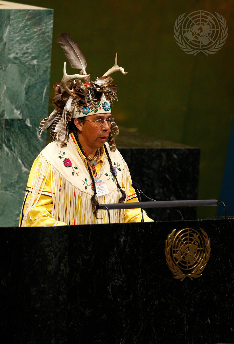 Todadaho Sid Hill, Chief of the Onondaga Nation, delivers the ceremonial welcome at the opening of the UN Permanent Forum on Indigenous Issues (UNPFII)’s eleventh session. The session this year emphasizes the theme, “The Doctrine of Discovery: Its Enduring Impact on Indigenous Peoples and the Right to Redress for Past Conquests”.