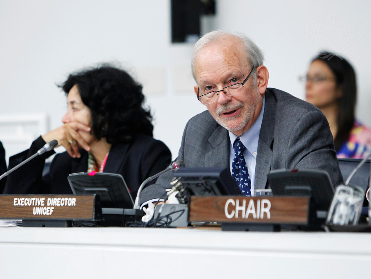 Anthony Lake (right), Executive Director of the UN Children's Fund (UNICEF), addresses the General Assembly's Third Committee (Social, Humanitarian and Cultural) at its meeting on the promotion and protection of the rights of children.