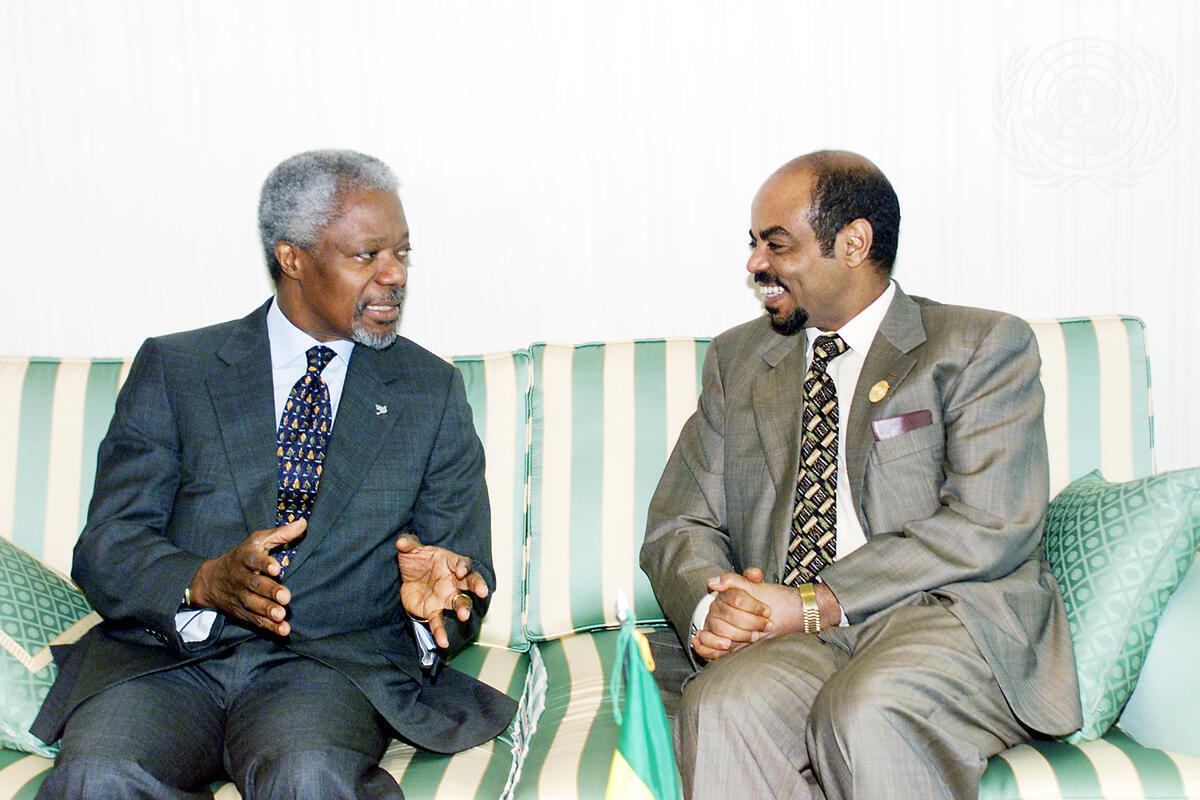 Secretary-General Kofi Annan (left), with Meles Zenawi, the Prime Minister of Ethiopia, at the site of the 35th Organization of African Unity (OAU) Summit.