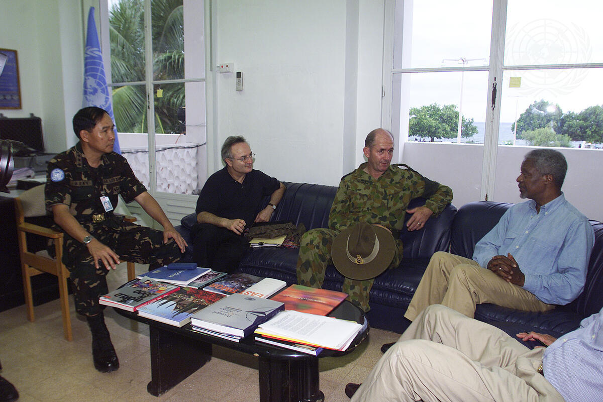 Secretary-General Kofi Annan (right) meeting with Major General Peter John Cosgrove of Australia (second from right), Force Commander of the International Force in East Timor (INTERFET); Lieutenant General Jaime de los Sanots (left), Force Commander of United Nations Transitional Administration in East Timor (UNTAET); and Bernard Miyet (second from left), UN Under-Secretary-General for Peacekeeping Operations.