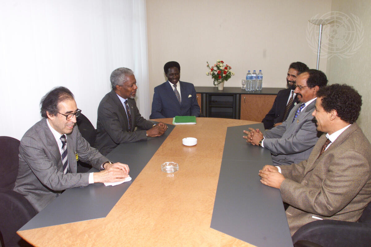 Secretary-General Kofi Annan (second from left) meets Mohamed Abdelaziz (second from right), Secretary-General of the Frente Popular para la Liberacion de Saguia el-Hamra y del Rio de Oro (Frente POLISARIO), at the site of the 35th Organization of African Unity (OAU) Summit.