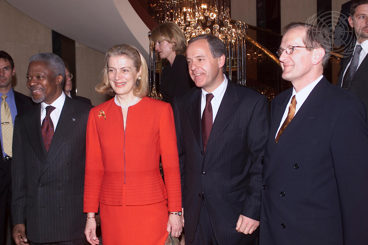 Left to right: Secretary-General Kofi Annan and Mrs. Nane Annan with Federal Councillor Joseph Deiss (right), Head of the Department of Foreign Affairs of Switzerland and Lukas Muhlemann, Chairman and CEO of Credit Suisse Group, in Zurich.